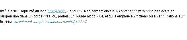 Définition de « liniment » de source académique (Académie Française, parution de 1986).