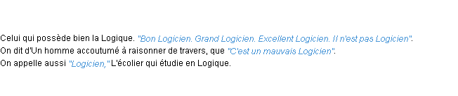 Ancienne définition développée dans dictionnaire académique, 1798.Merci à Arnaud et Pierre pour la numérisation du mot logicien.