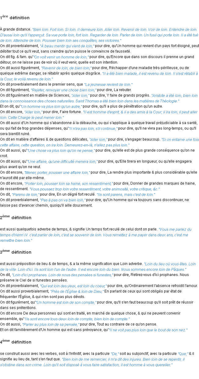 Ancienne définition de l’Académie Française (édition de 17962) pour le mot « loin ».Merci à Benoit et Jean-marie pour la numérisation du mot loin.