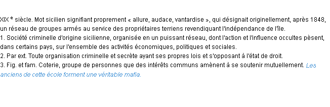 Signification issue du dico de l’Académie Française, parue en 1986.Merci à Arnaude et Gilberte pour la numérisation du mot mafia.