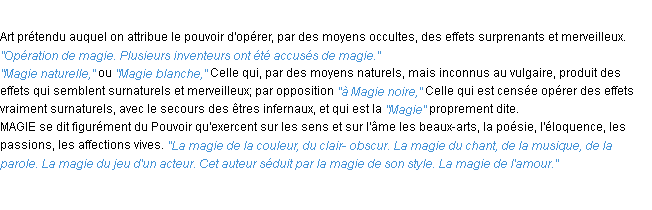 Ancienne signification développée en 1798 par l’académie Française (ACAD - 1798).Merci à Margot et Firmin pour la numérisation du mot magie.
