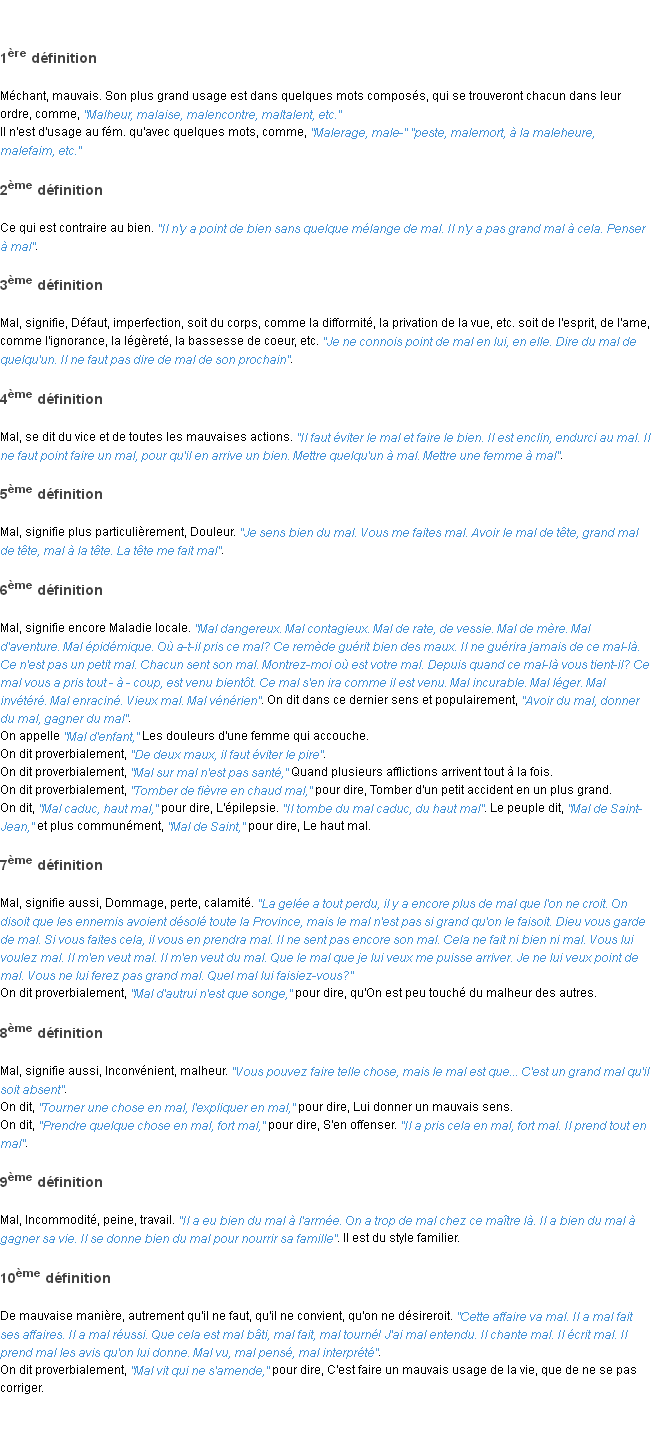 Définition « mal » du dictionnaire académique Français, parution de l’année 1932.