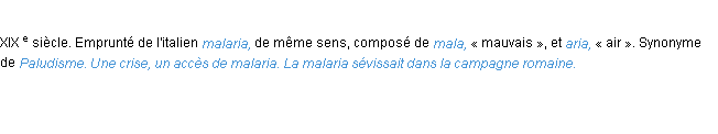 Définition du mot « malaria » (source wiktionary 2011).