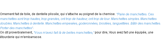 Ancienne signification développée en 1798 par l’académie Française (ACAD - 1798).Merci à Maximilien et Mélanie pour la numérisation du mot manchette.