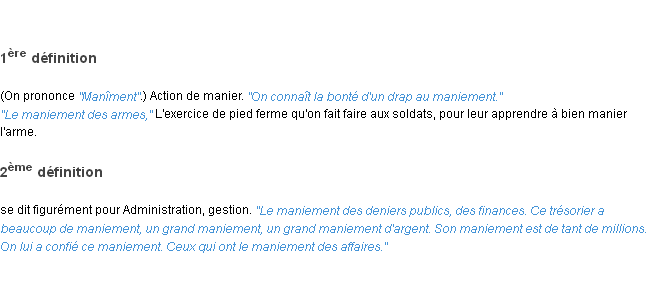 Ancienne signification parue en 1798 dans dictionnaire de l’Académie Française.Merci à Colette et Jeannot pour la numérisation du mot maniement.