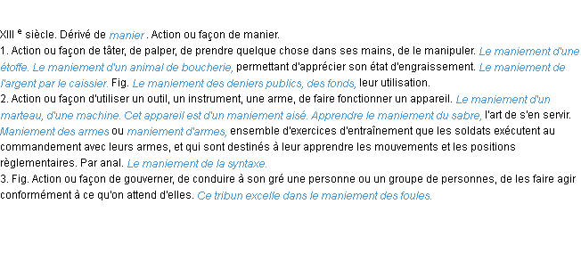 Signification éditée en 1932 pour le terme « maniement » par l’Académie Française.