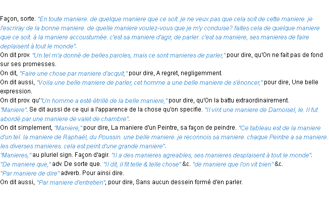 Ancienne définition « maniere » du dictionnaire académique Français, parution de l’année 1694.Merci à Olivie et Mariette pour la numérisation du mot maniere.