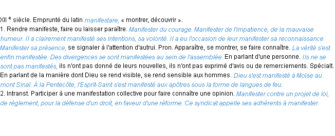 Définition « manifester » du dictionnaire académique Français, parution de l’année 1932.