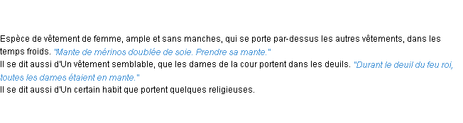 Ancienne signification parue en 1798 dans dictionnaire de l’Académie Française.Merci à Thierry et Angelique pour la numérisation du mot mante.