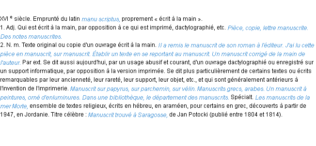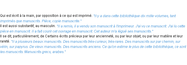 Définition de « manuscrit » de source académique (Académie Française, parution de 1986).