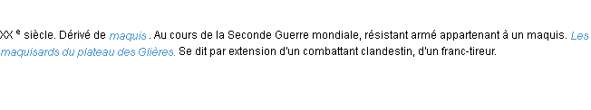 Définition du mot « maquisard » (source wiktionary 2011).Merci à Inès et Blaise pour la numérisation du mot maquisard.
