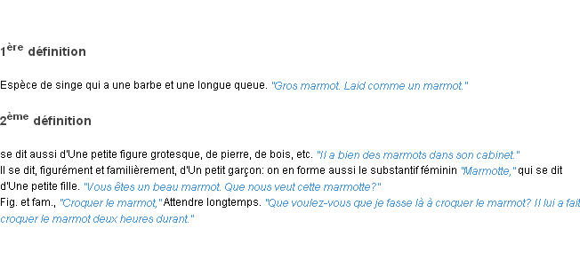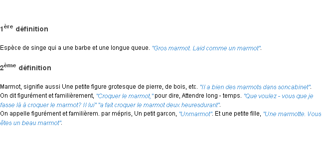 Ancienne signification du terme « marmot », parution de 1798, dictionnaire académique Français.Merci à Colombe et Arnaud pour la numérisation du mot marmot.