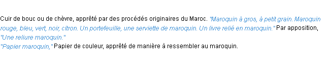 Ancienne définition « maroquin » du dictionnaire académique Français, parution de l’année 1798.Merci à Telesphore et Léonard pour la numérisation du mot maroquin.