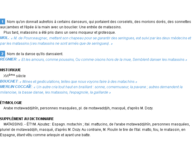 Définition de « matassins » issue du Littré (Auteur Emile Littré, édité en 1876).