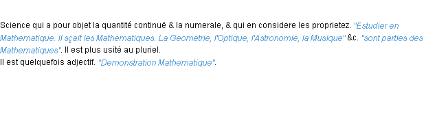 Ancienne définition développée dans dictionnaire académique, 1694.Merci à Sylvaine et Edwige pour la numérisation du mot mathematique.