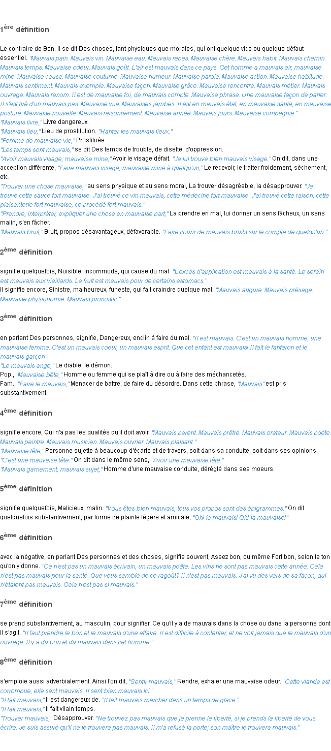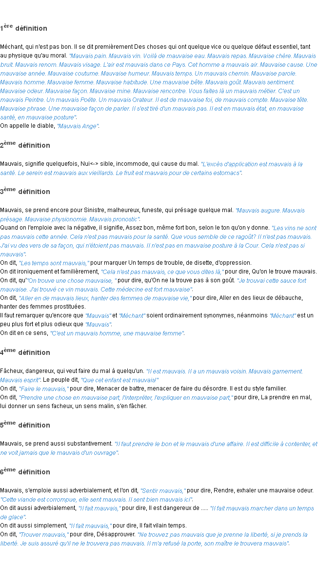 Définition du mot « mauvais » par l’équipe de la-definition.fr (édition de 2011).Merci à Chloé et Jolie pour la numérisation du mot mauvais.