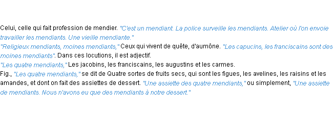 Signification du terme « mendiant », parution de 1932, dictionnaire académique Français.