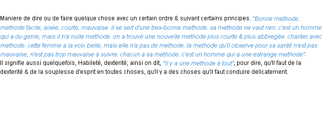 Ancienne signification parue en 1694 dans dictionnaire de l’Académie Française.Merci à Sylvianne et Irène pour la numérisation du mot methode.