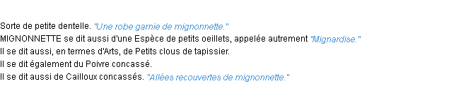 Ancienne définition de « mignonnette » de source académique (Académie Française, parution de 1798).