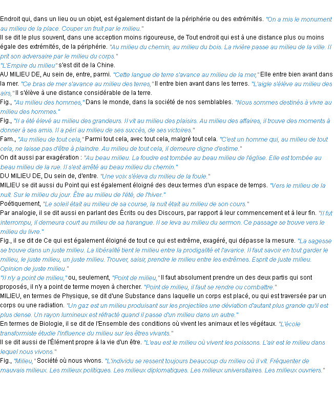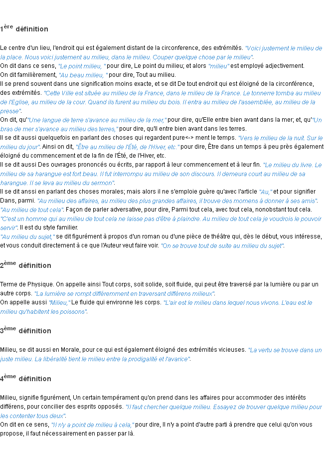 Ancienne signification du terme « milieu », parution de 1798, dictionnaire académique Français.