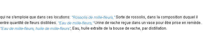 Signification développée en 1876 par Mr Littré (dictionnaire dit d’Emile Littré).Merci à Rémy et Pénélope pour la numérisation du mot mille-fleurs.