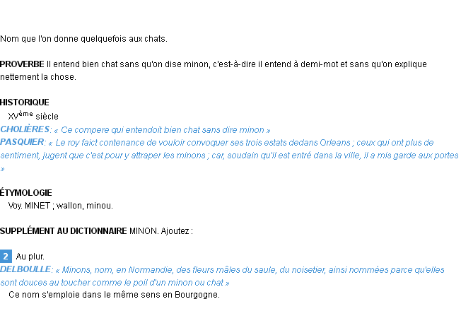 Ancienne signification éditée en 1798 pour le terme « minon » par l’Académie Française.