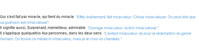Ancienne signification parue en 1798 dans dictionnaire de l’Académie Française.Merci à Armelle et Juliette pour la numérisation du mot miraculeux.