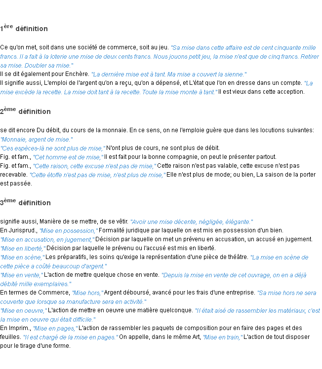 Ancienne définition de « mise » de source académique (Académie Française, parution de 1835).