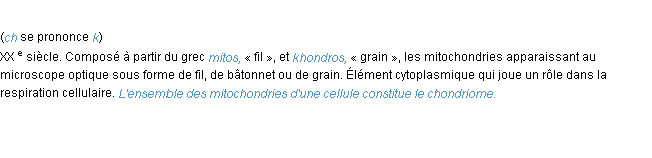 Définition issue du dictionnaire wiktionary pour le mot « mitochondrie ».