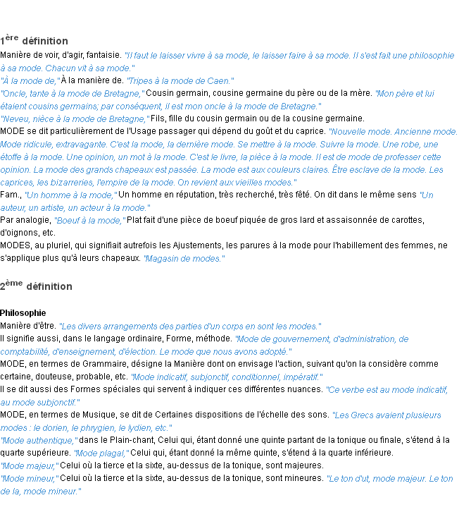 Ancienne définition de « mode » de source académique (Académie Française, parution de 1835).