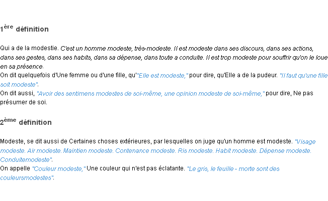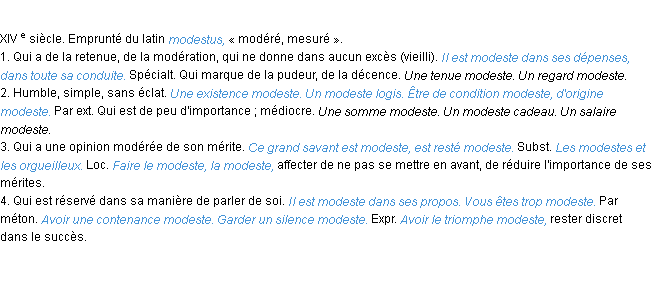 Ancienne signification éditée en 1798 pour le terme « modeste » par l’Académie Française.Merci à Adèle et Faustine pour la numérisation du mot modeste.