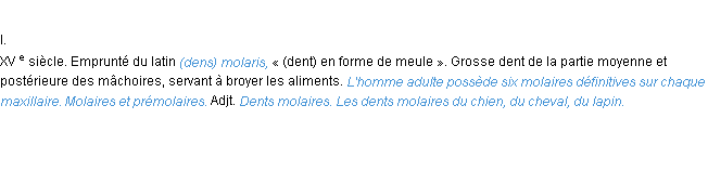 Ancienne signification éditée en 1798 pour le terme « molaire » par l’Académie Française.Merci à Virginie et Gérard pour la numérisation du mot molaire.