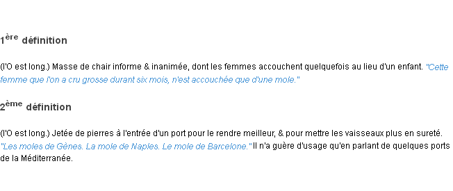 Ancienne définition de l’Académie Française (édition de 17962) pour le mot « mole ».Merci à Valérie et Doriane pour la numérisation du mot mole.