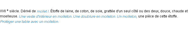 Ancienne signification parue en 1798 dans dictionnaire de l’Académie Française.Merci à Iréné et Olivier pour la numérisation du mot molleton.