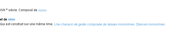 Signification du terme « monorime », parution de 1876 (dictionnaire le Littré).Merci à Seraphine et Ozanne pour la numérisation du mot monorime.