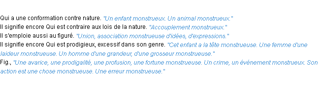 Signification du terme « monstrueux », parution de 1986, dictionnaire académique Français.