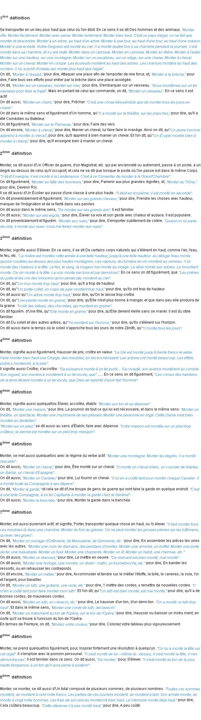Ancienne signification issue du dico de l’Académie Française, parue en 17962.Merci à Armand et élise pour la numérisation du mot monter.