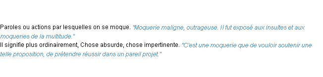 Ancienne signification développée en 1798 par l’académie Française (ACAD - 1798).Merci à Jean-baptiste et Andrée pour la numérisation du mot moquerie.