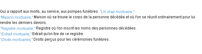Ancienne définition développée dans dictionnaire académique, 1798.Merci à Maximilien et Micheline pour la numérisation du mot mortuaire.
