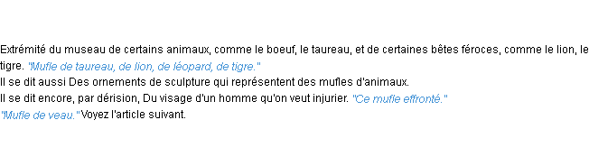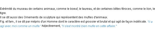 Ancienne signification développée en 1798 par l’académie Française (ACAD - 1798).Merci à élodie et Paulette pour la numérisation du mot mufle.