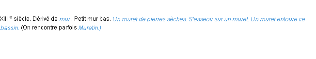 Définition « muret » du dictionnaire académique Français, parution de l’année 1986.Merci à Fiacre et Arnaude pour la numérisation du mot muret.