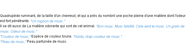 Ancienne signification éditée par l’Académie Française, année 1798.Merci à Bénédicte et Théo pour la numérisation du mot musc.