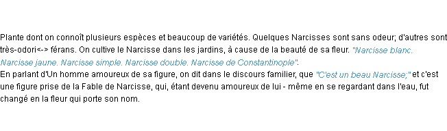 Ancienne définition académique pour le terme « narcisse » (parue en 1798).Merci à Mignon et Jolie pour la numérisation du mot narcisse.
