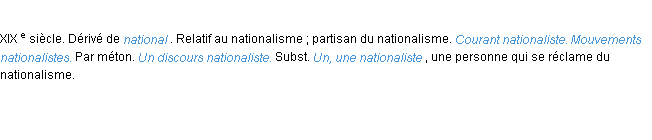 Signification parue en 2009 (source la-definition.fr).Merci à Eléonore et Noella pour la numérisation du mot nationaliste.