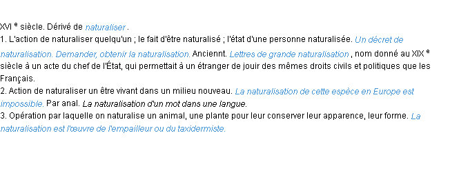 Ancienne signification développée en 1798 par l’académie Française (ACAD - 1798).Merci à Cerise et Blaise pour la numérisation du mot naturalisation.