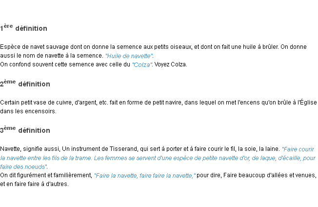 Ancienne signification parue en 1798 dans dictionnaire de l’Académie Française.Merci à édouard et Hugues pour la numérisation du mot navette.