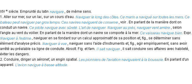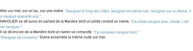 Ancienne définition académique pour le terme « naviguer » (parue en 1798).Merci à Dominique et Laurent pour la numérisation du mot naviguer.