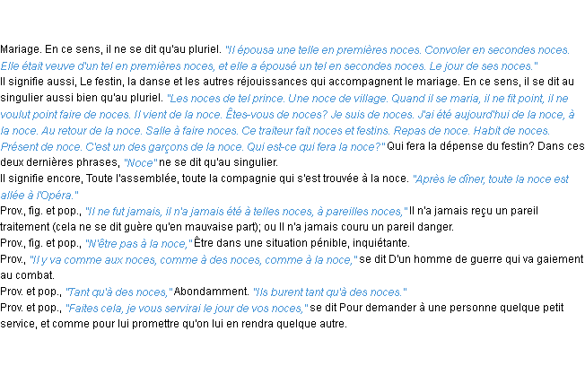 Ancienne signification éditée par l’Académie Française, année 1798.Merci à Eléonore et Seraphine pour la numérisation du mot noce.