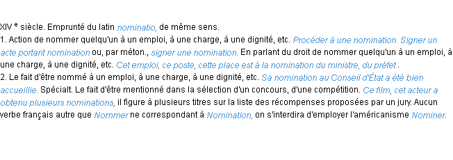 Ancienne signification issue du dico de l’Académie Française, parue en 1798.Merci à Ignace et Thierry pour la numérisation du mot nomination.