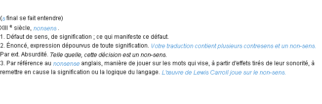 Signification développée en 1876 par Mr Littré (dictionnaire dit d’Emile Littré).Merci à Placide et Sylvie pour la numérisation du mot non-sens.